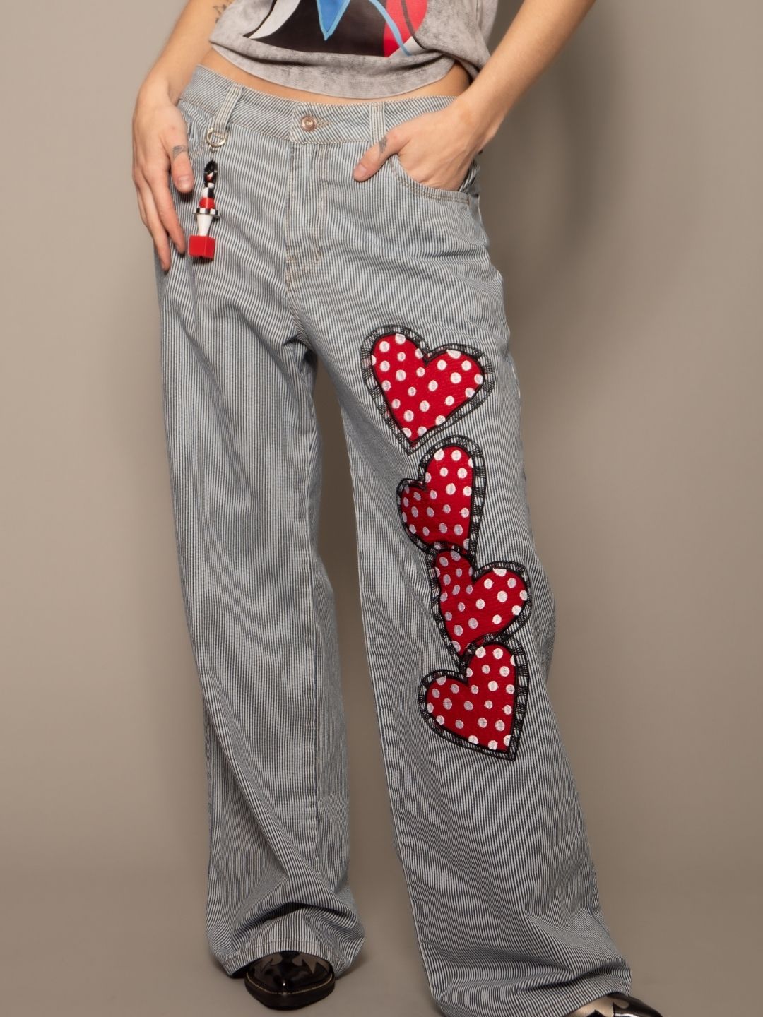 Jean Florentina: rayas sutiles en bota recta que favorecen tu figura. Bordado de corazones en la bota izquierda y llavero integrado. Diseño versátil que combina comodidad y estilo. La prenda que buscabas para destacar con personalidad.