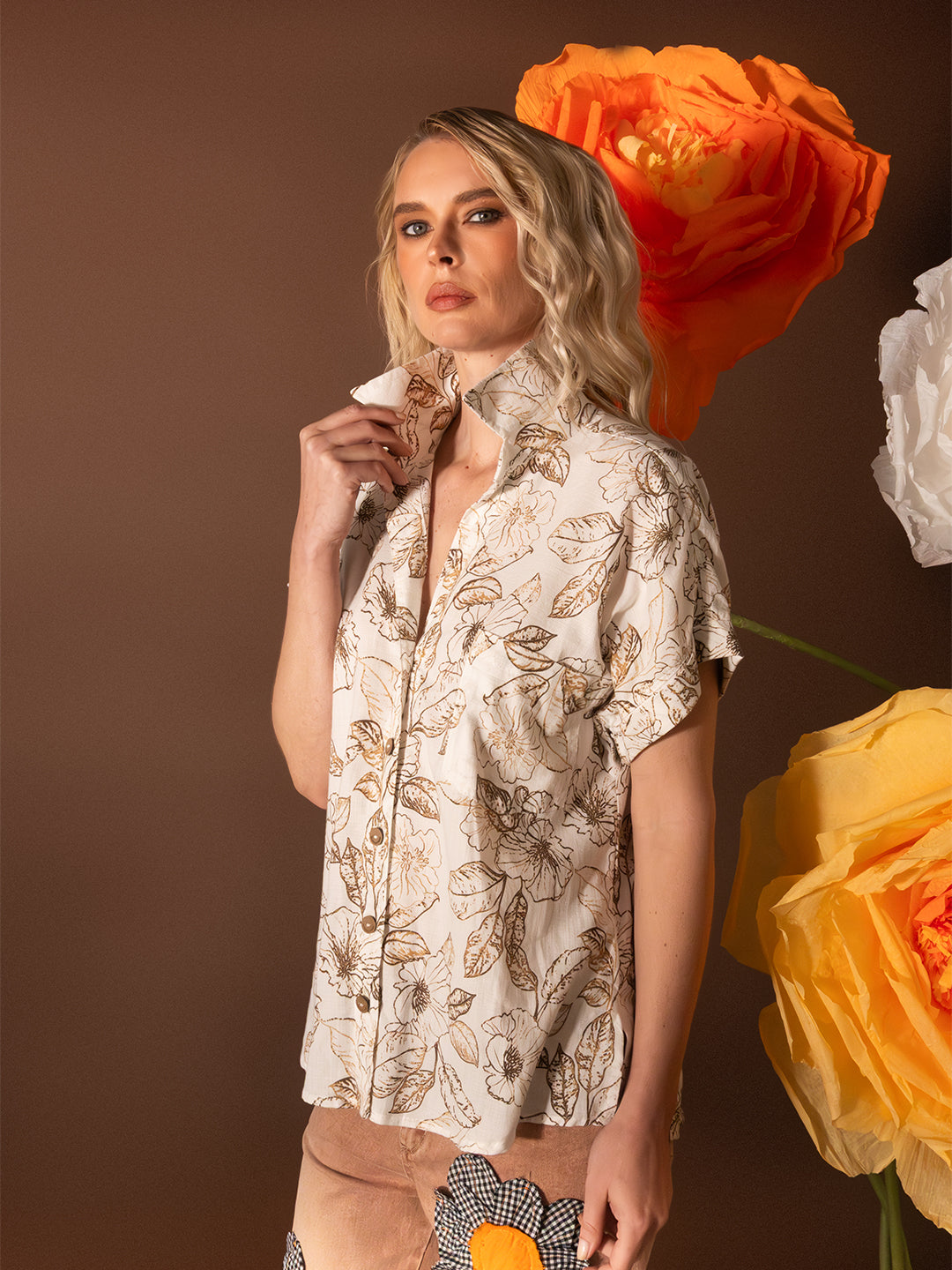 Blusa manga corta con estampado floral en tonos tierra que combina comodidad y estilo. Diseño único en talla única, perfecta para looks casuales de día. La combinación de colores naturales se adapta a cualquier guardarroba, ofreciendo versatilidad para crear diferentes outfits. Ideal para climas cálidos o como pieza versátil en transiciones de temporada. Una prenda con carácter que destaca por su originalidad.
