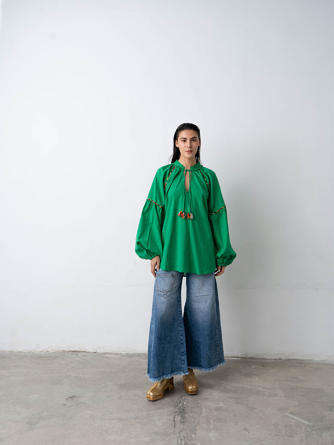 El detalle de cuello de la blusa adornado con ROUCHE, que es un tipo de pliegue que se crea en la tela para dar un efecto de volumen y textura, además de unas mangas amplias para dar a la blusa un estilo fresco y muy innovador.
