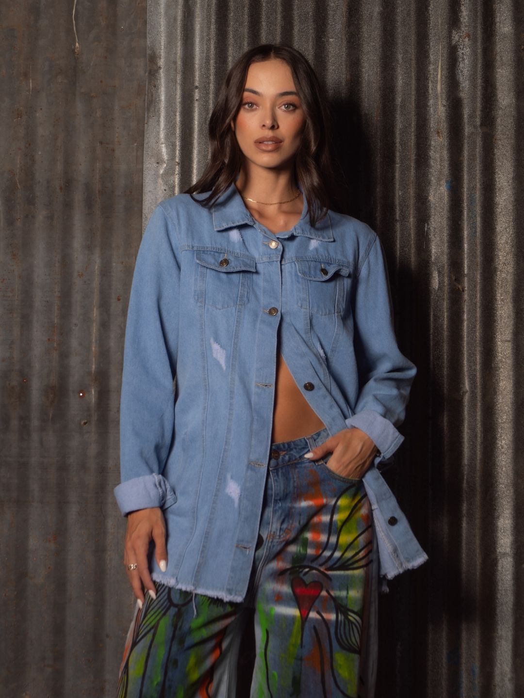 Esta chaqueta gaban de denim azul claro, con un exclusivo bordado en la espalda, es la prenda perfecta para combinar estilo y comodidad. Úsala abierta para un look relajado o cerrada para mayor calidez. Diseño versátil en talla única que se adapta a ti. ¡Destaca con autenticidad!