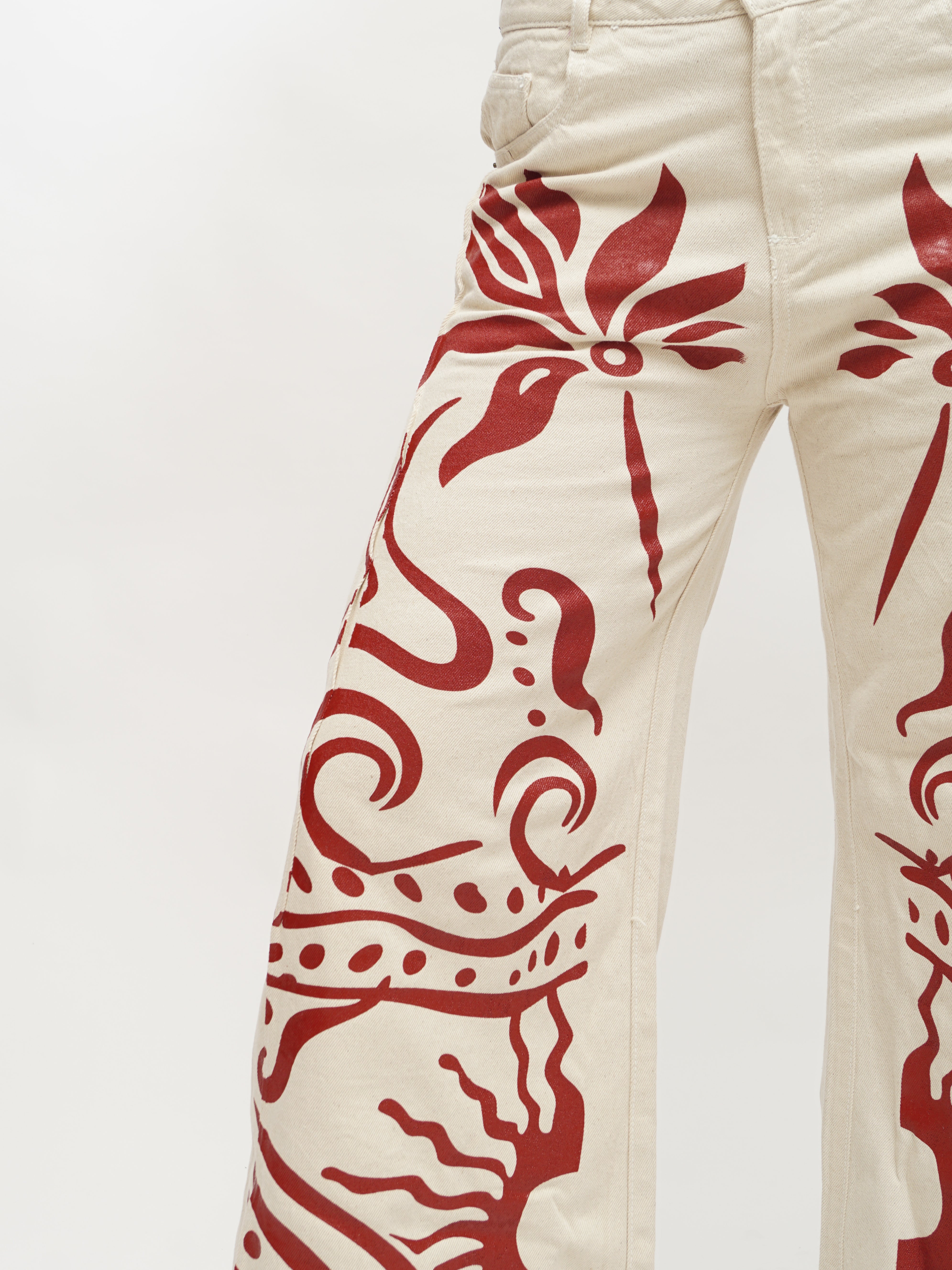 Jeans con estampados abstractos inspirados en la naturaleza, ideal para aquellos que buscan agregar un toque de personalidad y estilo a su outfit.