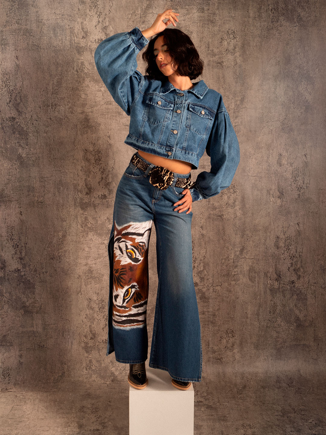 El jean tigre es un estilo único y cómodo gracias a su abertura y pintado en una bota. Con tiro largo, es ideal para cualquier ocasión. Domina tu estilo con esta prenda versátil.