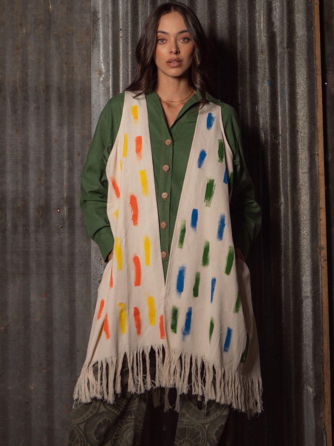 Este kimono único está elaborado a mano en telar por artistas del Eje Cafetero. Sin mangas y desflecado, cada pieza es un lienzo vivo con pintura artesanal que resalta la riqueza cultural. Diseño talla única que te conecta con la tradición y el arte en cada uso.