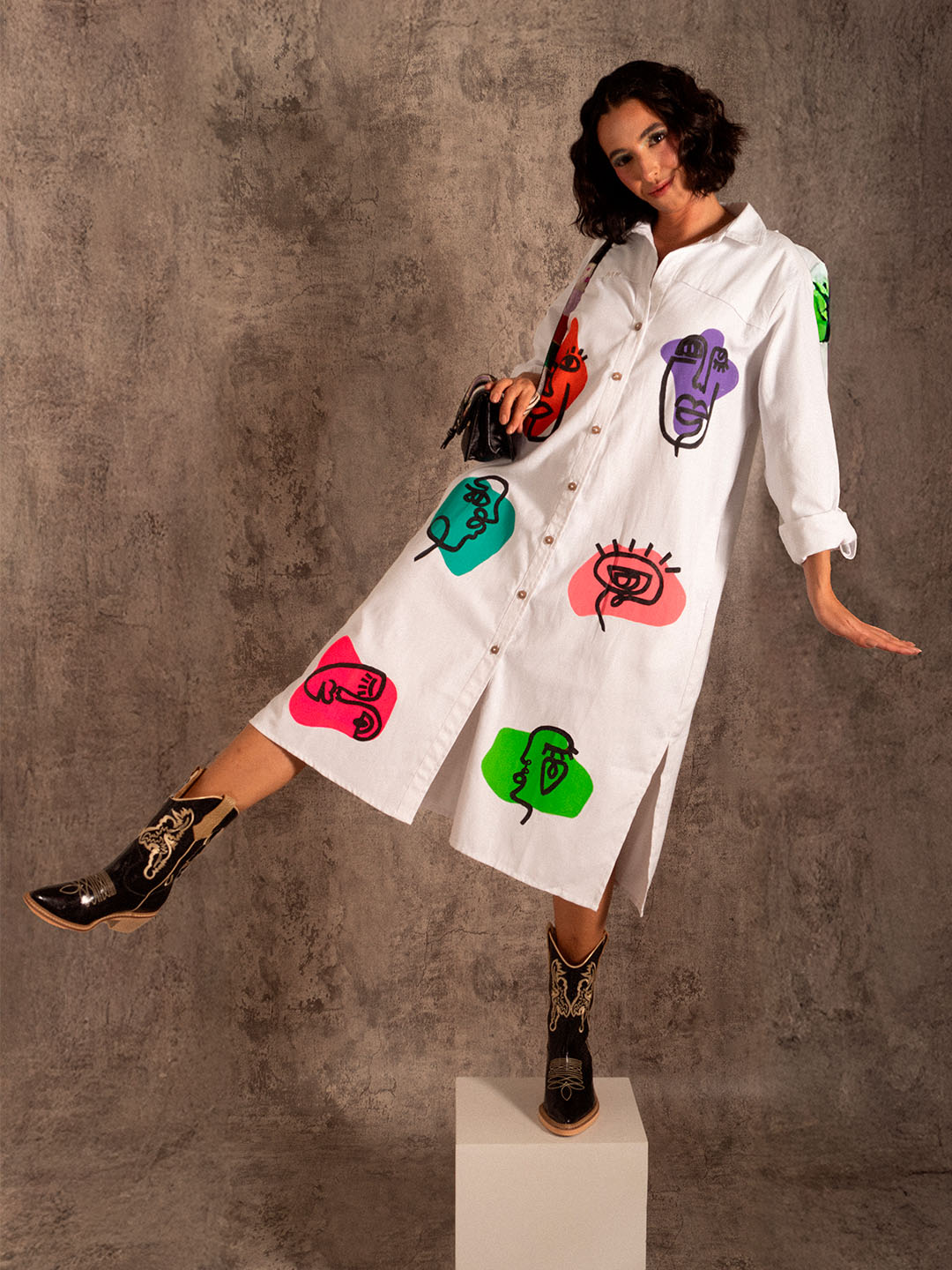 ¡Este Sobretodo Caras es una obra maestra! Hecho en tela popelina y pintado a mano por los artesanos del Quindío, es un camisero tipo vestido perfecto para aquellos que buscan un estilo único y original.